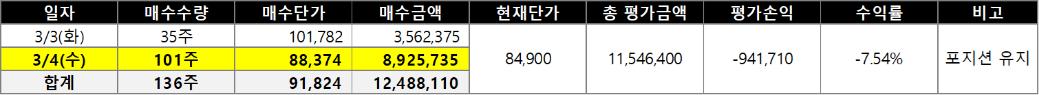 조건 1. 3/3(화) 주식시장 개장 후 2% 갭 하락 시 즉시 매수 (100~150만원)